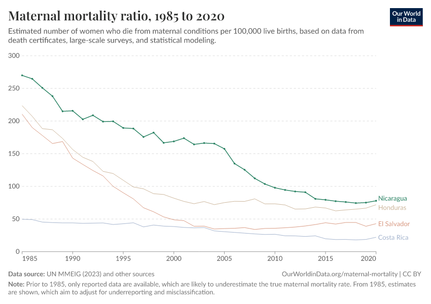 In the chart, you can see Nicaragua’s maternal mortality rates over time, alongside neighboring countries for comparison. This is measured as the number of deaths per 100,000 live births.
