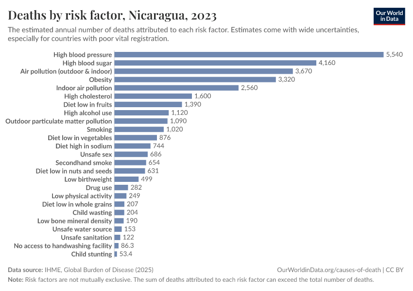 In the chart, you can see modeled estimates for how many people in Nicaragua die prematurely as a result of various risk factors. Note that the same death can be attributed to multiple risk factors, so the death tolls from different risk factors cannot simply be added up (this is why their sum can be higher than the total number of deaths).