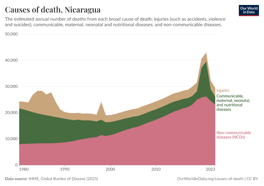 In the chart, you can see the breakdown of deaths in Nicaragua by these broad categories. In 2023, 3,020 died from communicable diseases, 23,100 from NCDs, and 3,300 from injuries.