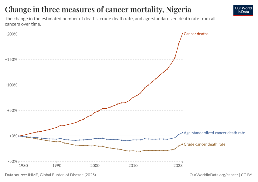 Again, we can use the same indicators to understand mortality: the total number of deaths, the crude death rate (which simply divides the number of deaths by the country’s population), or the age-standardized death rate, which holds the age structure of the population constant, so it tells us about how rates are changing regardless of aging. This is important because the risk of most cancers also increases steeply with age.