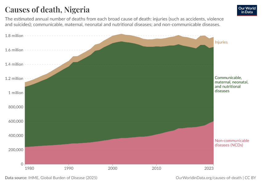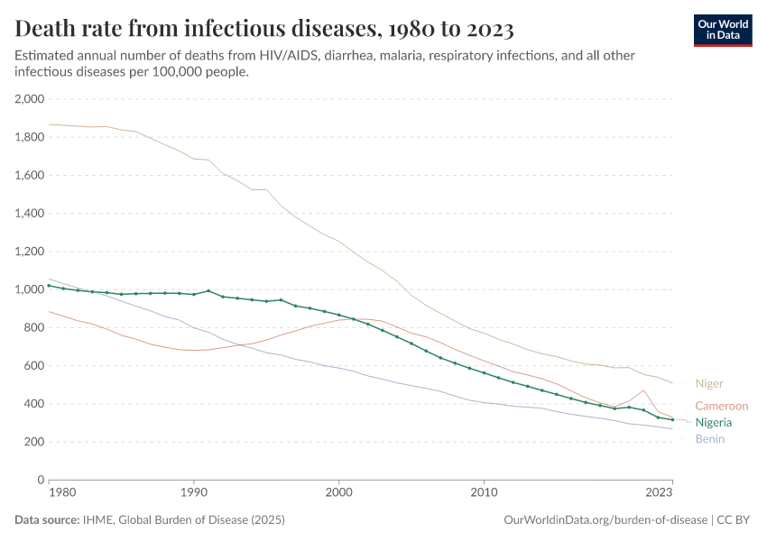 In the chart, you can see how death rates from communicable diseases in Nigeria have changed over time. This is shown alongside neighboring countries for comparison.