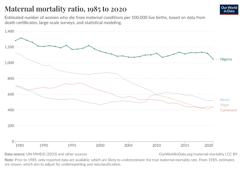 In the chart, you can see Nigeria’s maternal mortality rates over time, alongside neighboring countries for comparison. This is measured as the number of deaths per 100,000 live births.