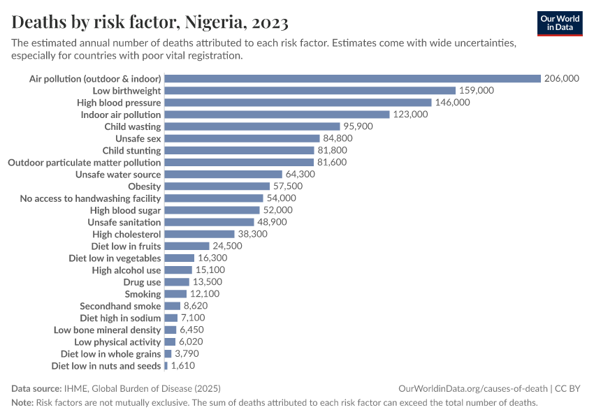 In the chart, you can see modeled estimates for how many people in Nigeria die prematurely as a result of various risk factors. Note that the same death can be attributed to multiple risk factors, so the death tolls from different risk factors cannot simply be added up (this is why their sum can be higher than the total number of deaths).