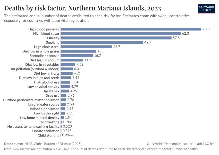 In the chart, you can see modeled estimates for how many people in the Northern Mariana Islands die prematurely as a result of various risk factors. Note that the same death can be attributed to multiple risk factors, so the death tolls from different risk factors cannot simply be added up (this is why their sum can be higher than the total number of deaths).