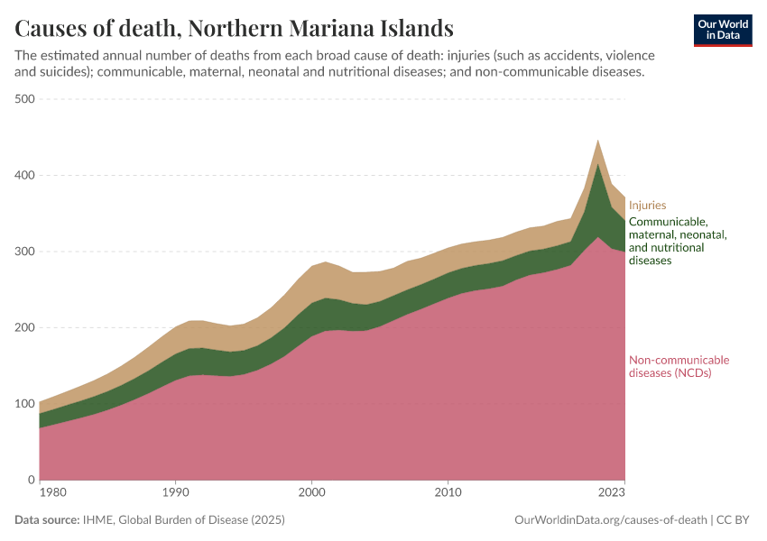 In the chart, you can see how death rates from communicable diseases in the Northern Mariana Islands have changed over time. This is shown alongside neighboring countries for comparison.