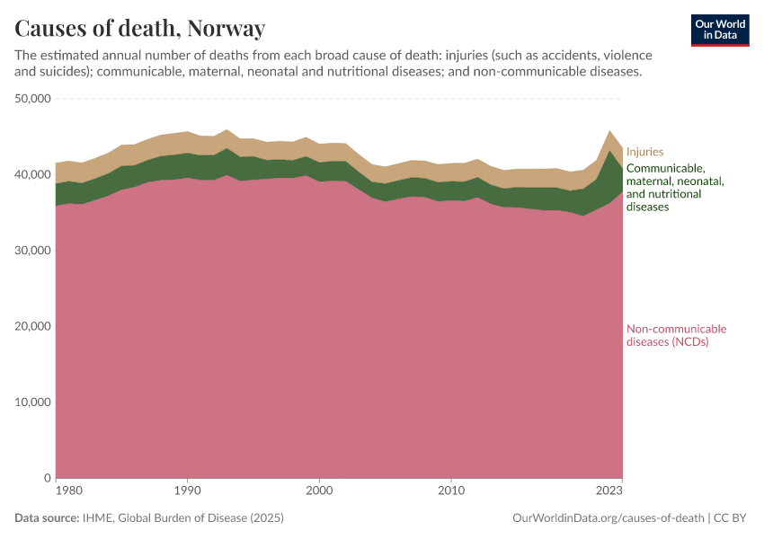 In the chart, you can see the breakdown of deaths in Norway by these broad categories. In 2023, 3,010 died from communicable diseases, 37,800 from NCDs, and 2,710 from injuries.