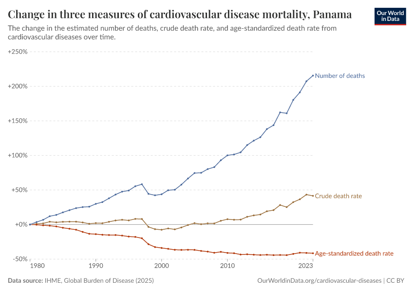 There are several metrics we can use to understand mortality: the total number of deaths, the crude death rate (which simply divides the number of deaths by the country’s population), or the age-standardized death rate, which holds the age structure of the population constant, removing the effect of population aging from the trend.