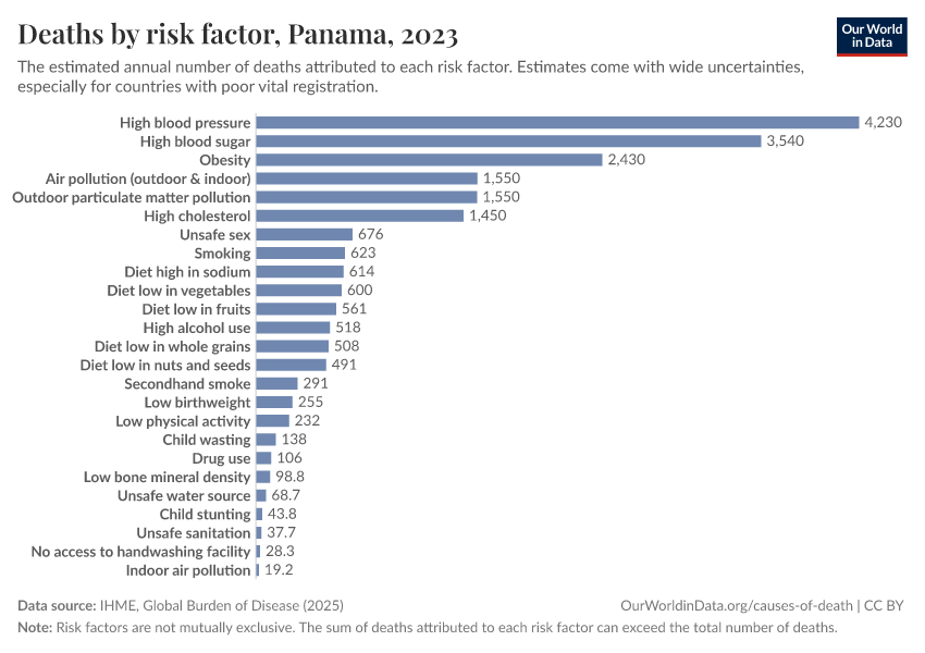 In the chart, you can see modeled estimates for how many people in Panama die prematurely as a result of various risk factors. Note that the same death can be attributed to multiple risk factors, so the death tolls from different risk factors cannot simply be added up (this is why their sum can be higher than the total number of deaths).