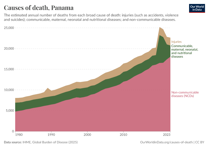In the chart, you can see the breakdown of deaths in Panama by these broad categories. In 2023, 2,730 died from communicable diseases, 18,000 from NCDs, and 1,870 from injuries.