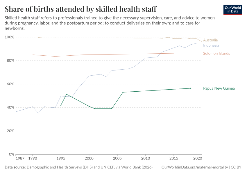 In the chart, you see the share of births attended by skilled workers in Papua New Guinea, alongside its neighbors. In 2018, this share was 56%.