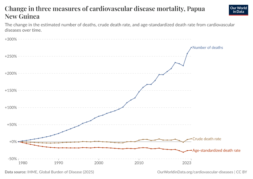 In the chart, you can see how death rates from communicable diseases in Papua New Guinea have changed over time. This is shown alongside neighboring countries for comparison.