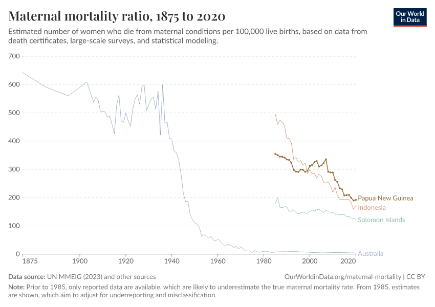 In the chart, you can see Papua New Guinea’s maternal mortality rates over time, alongside neighboring countries for comparison. This is measured as the number of deaths per 100,000 live births.
