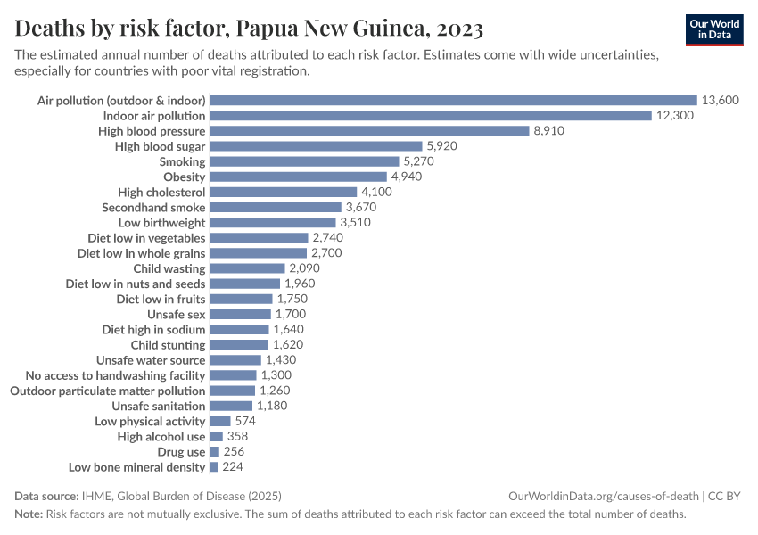 In the chart, you can see modeled estimates for how many people in Papua New Guinea die prematurely as a result of various risk factors. Note that the same death can be attributed to multiple risk factors, so the death tolls from different risk factors cannot simply be added up (this is why their sum can be higher than the total number of deaths).