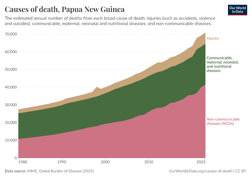 In the chart, you can see the breakdown of deaths in Papua New Guinea by these broad categories. In 2023, 23,000 died from communicable diseases, 41,500 from NCDs, and 6,300 from injuries.