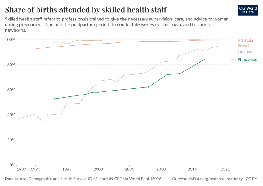 In the chart, you see the share of births attended by skilled workers in the Philippines, alongside its neighbors. In 2017, this share was 84%.
