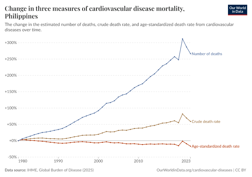 There are several metrics we can use to understand mortality: the total number of deaths, the crude death rate (which simply divides the number of deaths by the country’s population), or the age-standardized death rate, which holds the age structure of the population constant, removing the effect of population aging from the trend.