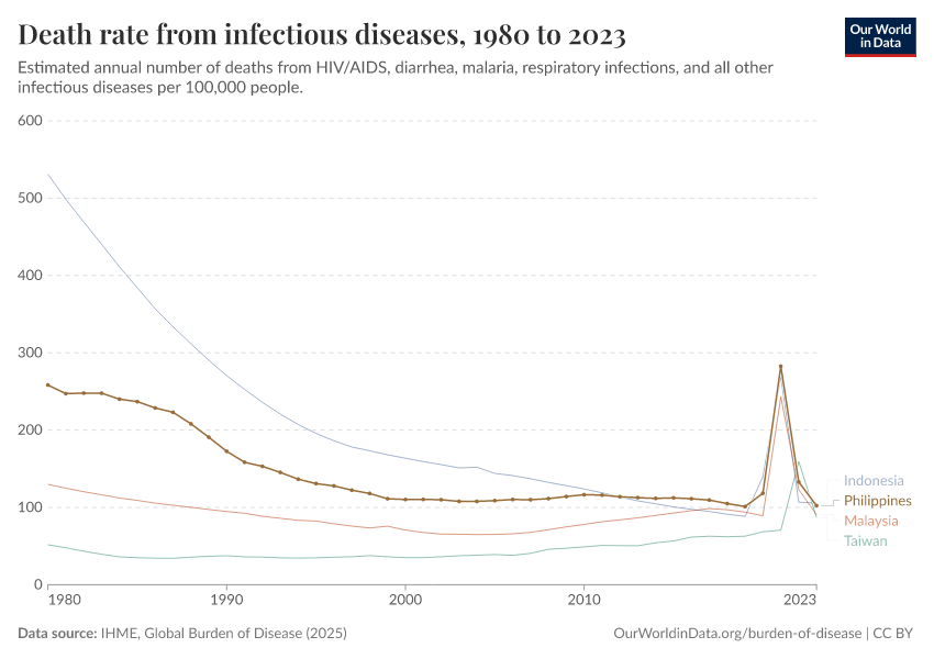 In the chart, you can see how death rates from communicable diseases in the Philippines have changed over time. This is shown alongside neighboring countries for comparison.