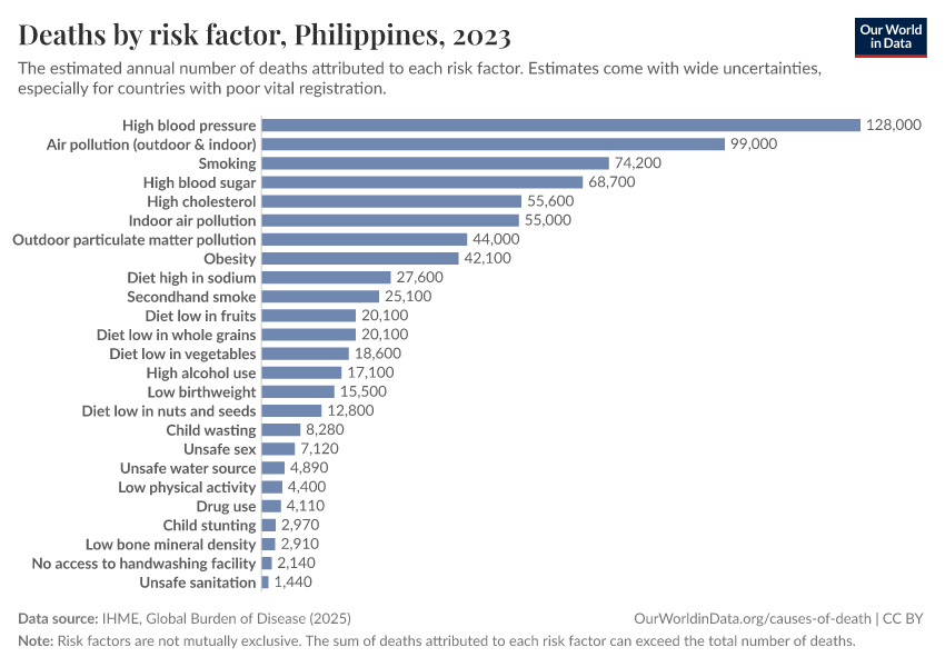In the chart, you can see modeled estimates for how many people in the Philippines die prematurely as a result of various risk factors. Note that the same death can be attributed to multiple risk factors, so the death tolls from different risk factors cannot simply be added up (this is why their sum can be higher than the total number of deaths).