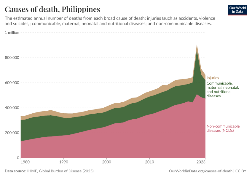 In the chart, you can see the breakdown of deaths in the Philippines by these broad categories. In 2023, 144,000 died from communicable diseases, 474,000 from NCDs, and 43,700 from injuries.