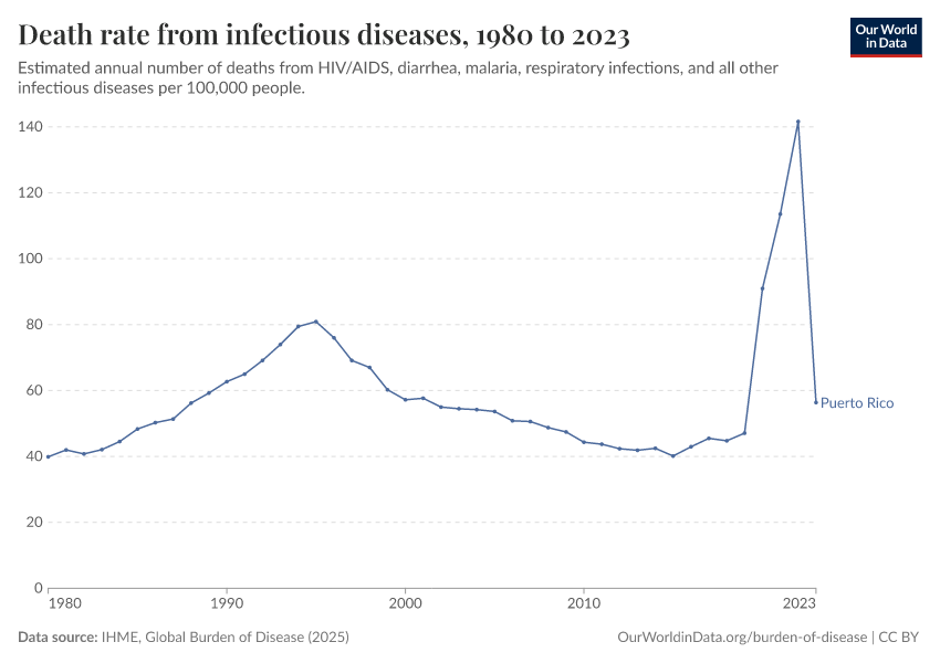 In the chart, you can see how death rates from communicable diseases in Puerto Rico have changed over time. This is shown alongside neighboring countries for comparison.