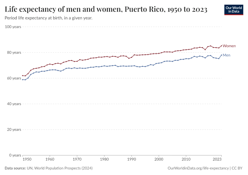 In the chart, you can see life expectancy at birth for men and women in Puerto Rico.