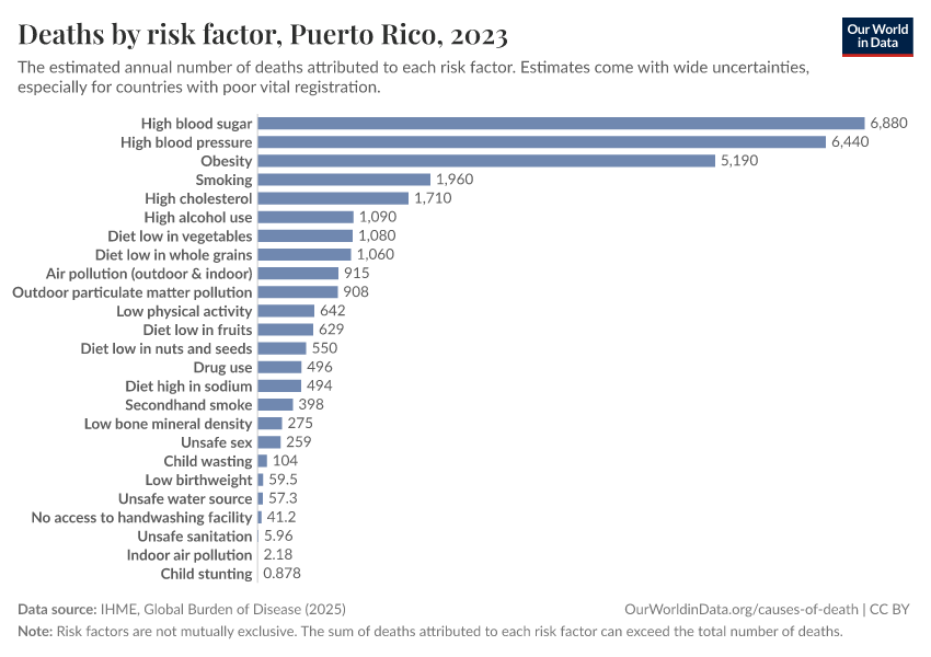 In the chart, you can see modeled estimates for how many people in Puerto Rico die prematurely as a result of various risk factors. Note that the same death can be attributed to multiple risk factors, so the death tolls from different risk factors cannot simply be added up (this is why their sum can be higher than the total number of deaths).