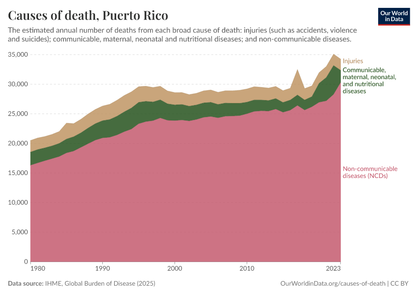 In the chart, you can see the breakdown of deaths in Puerto Rico by these broad categories. In 2023, 2,050 died from communicable diseases, 30,300 from NCDs, and 1,890 from injuries.