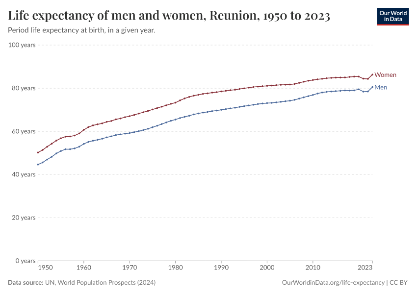 In the chart, you can see life expectancy at birth for men and women in Reunion.