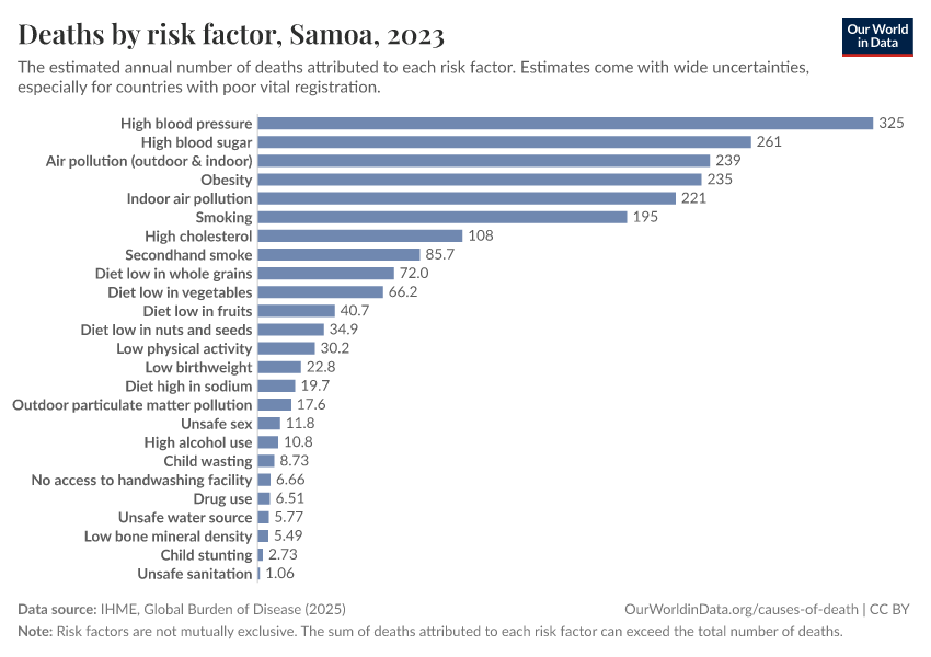 In the chart, you can see modeled estimates for how many people in Samoa die prematurely as a result of various risk factors. Note that the same death can be attributed to multiple risk factors, so the death tolls from different risk factors cannot simply be added up (this is why their sum can be higher than the total number of deaths).