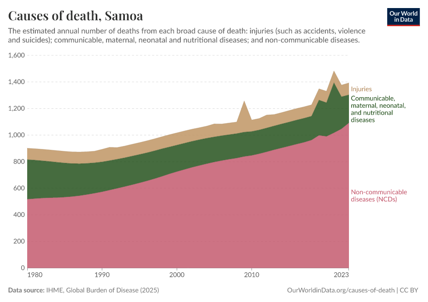 In the chart, you can see the breakdown of deaths in Samoa by these broad categories. In 2023, 212 died from communicable diseases, 1,090 from NCDs, and 89.8 from injuries.