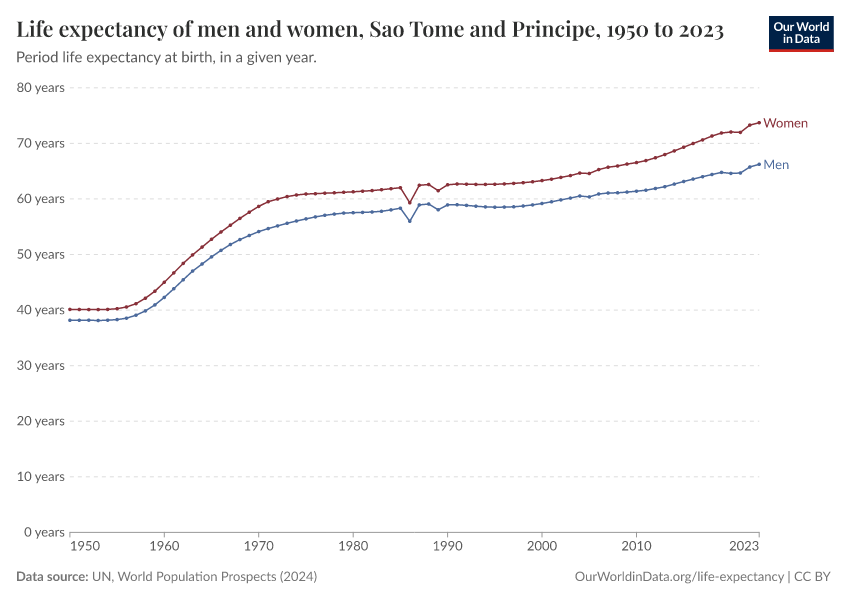 In the chart, you can see life expectancy at birth for men and women in Sao Tome and Principe.