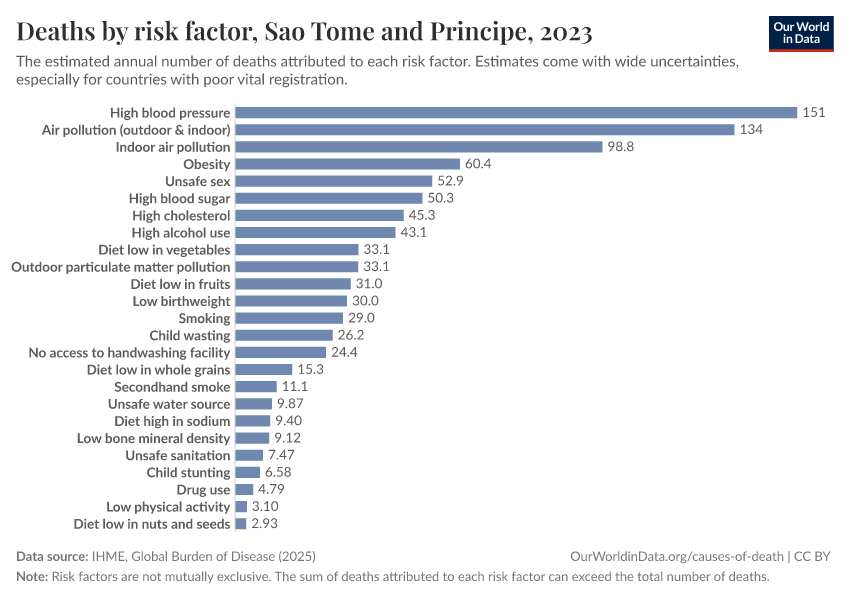 In the chart, you can see modeled estimates for how many people in Sao Tome and Principe die prematurely as a result of various risk factors. Note that the same death can be attributed to multiple risk factors, so the death tolls from different risk factors cannot simply be added up (this is why their sum can be higher than the total number of deaths).