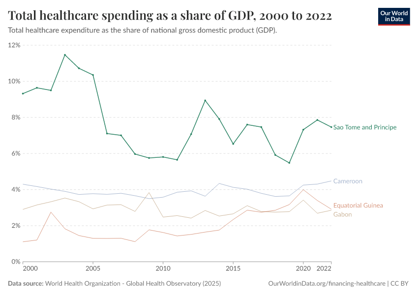 In 2022, Sao Tome and Principe’s healthcare spending was equivalent to 7.5% of its national gross domestic product (GDP).