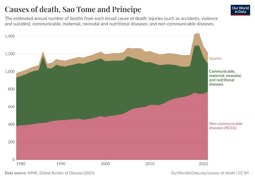 In the chart, you can see the breakdown of deaths in Sao Tome and Principe by these broad categories. In 2023, 315 died from communicable diseases, 773 from NCDs, and 125 from injuries.