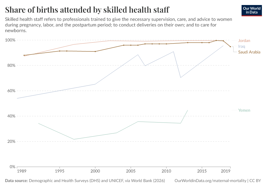 In the chart, you see the share of births attended by skilled workers in Saudi Arabia, alongside its neighbors. In 2019, this share was 95%.