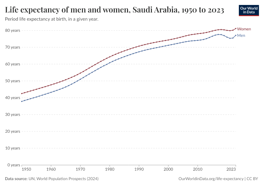 In the chart, you can see life expectancy at birth for men and women in Saudi Arabia.