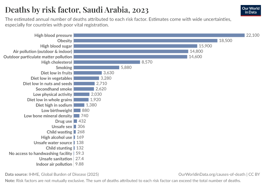 In the chart, you can see modeled estimates for how many people in Saudi Arabia die prematurely as a result of various risk factors. Note that the same death can be attributed to multiple risk factors, so the death tolls from different risk factors cannot simply be added up (this is why their sum can be higher than the total number of deaths).