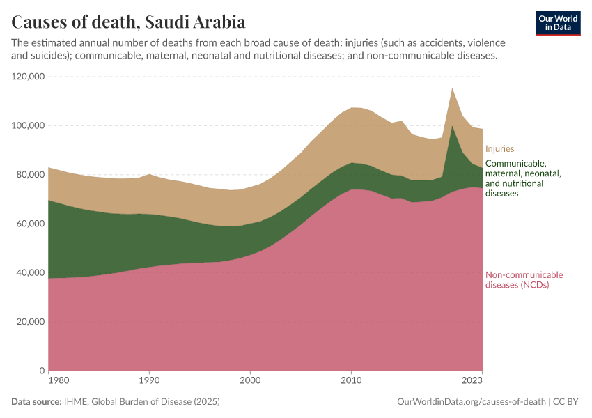 In the chart, you can see the breakdown of deaths in Saudi Arabia by these broad categories. In 2023, 8,290 died from communicable diseases, 74,500 from NCDs, and 15,800 from injuries.