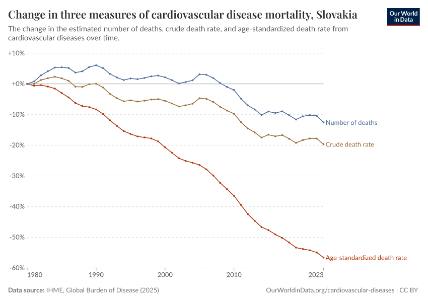 In the chart, you can see how death rates from communicable diseases in Slovakia have changed over time. This is shown alongside neighboring countries for comparison.