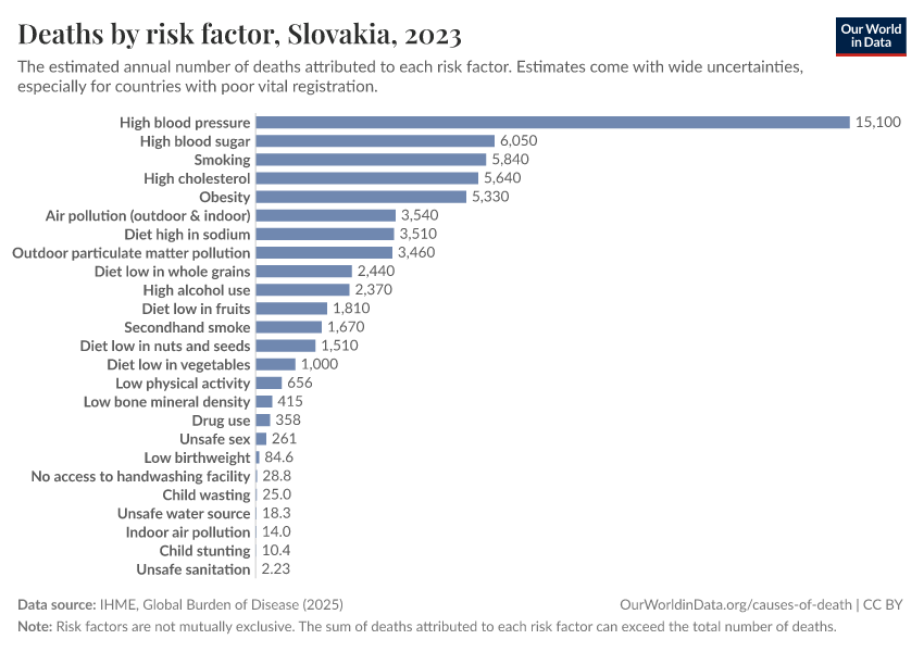 In the chart, you can see modeled estimates for how many people in Slovakia die prematurely as a result of various risk factors. Note that the same death can be attributed to multiple risk factors, so the death tolls from different risk factors cannot simply be added up (this is why their sum can be higher than the total number of deaths).