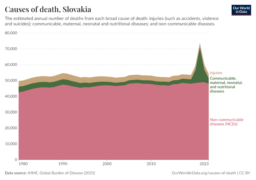 In the chart, you can see the breakdown of deaths in Slovakia by these broad categories. In 2023, 3,290 died from communicable diseases, 48,000 from NCDs, and 2,870 from injuries.