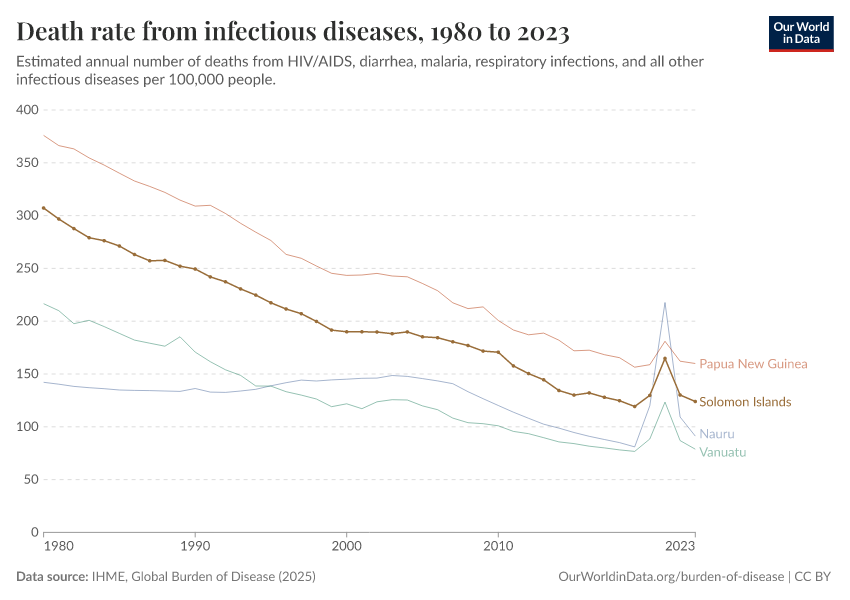 In the chart, you can see how death rates from communicable diseases in the Solomon Islands have changed over time. This is shown alongside neighboring countries for comparison.