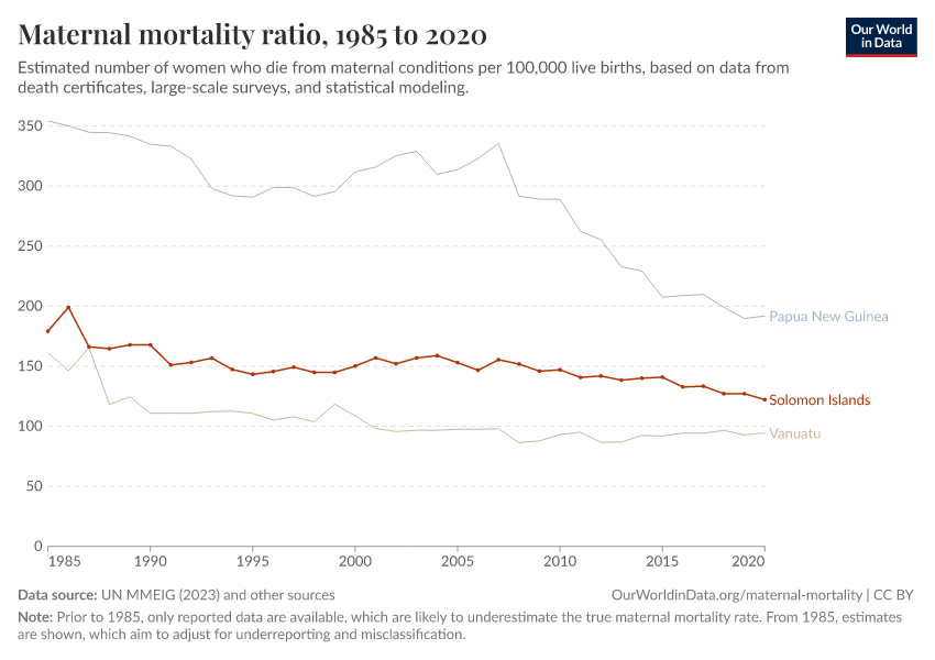 In the chart, you can see the Solomon Islands’ maternal mortality rates over time, alongside neighboring countries for comparison. This is measured as the number of deaths per 100,000 live births.