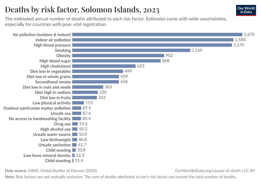 In the chart, you can see modeled estimates for how many people in the Solomon Islands die prematurely as a result of various risk factors. Note that the same death can be attributed to multiple risk factors, so the death tolls from different risk factors cannot simply be added up (this is why their sum can be higher than the total number of deaths).