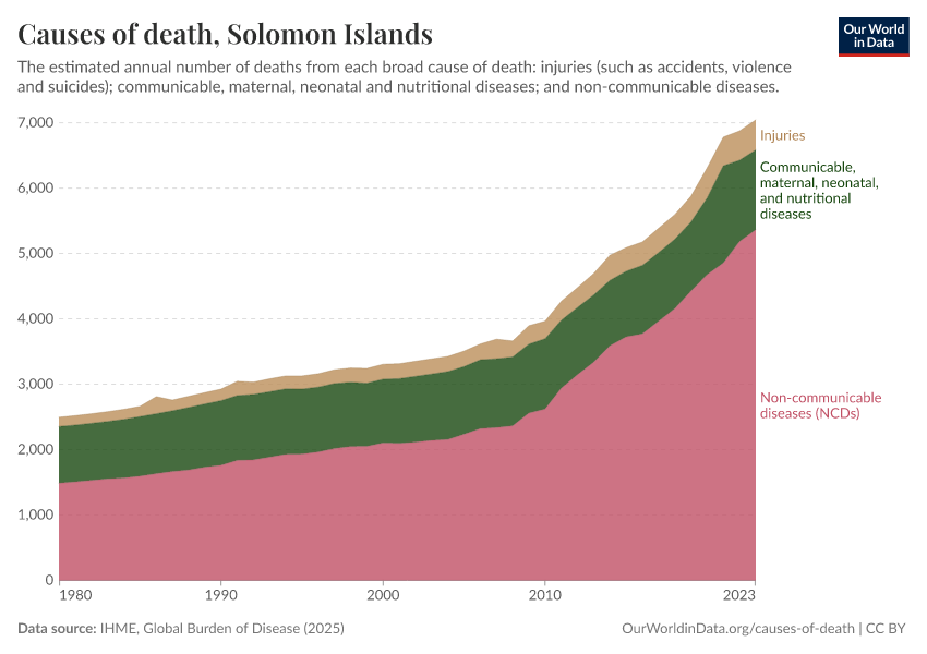In the chart, you can see the breakdown of deaths in the Solomon Islands by these broad categories. In 2023, 1,220 died from communicable diseases, 5,360 from NCDs, and 461 from injuries.