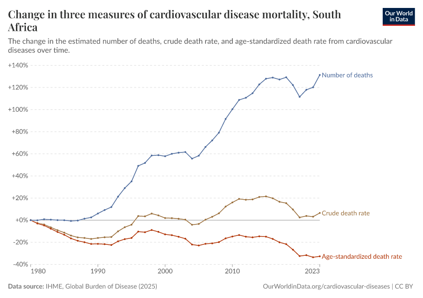 Are deaths from cardiovascular disease in South Africa increasing or decreasing?