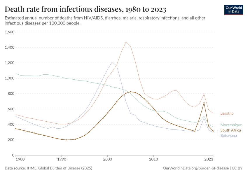 In the chart, you can see how death rates from communicable diseases in South Africa have changed over time. This is shown alongside neighboring countries for comparison.