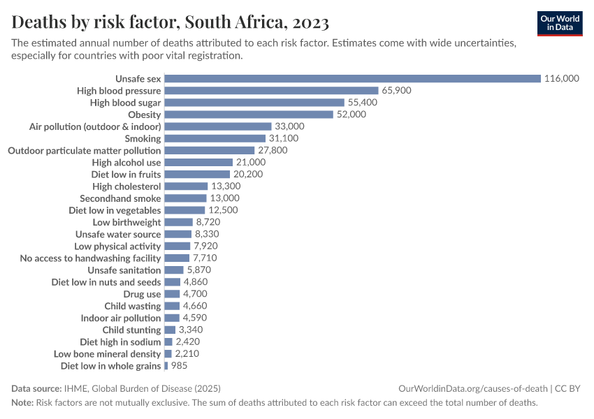 In the chart, you can see modeled estimates for how many people in South Africa die prematurely as a result of various risk factors. Note that the same death can be attributed to multiple risk factors, so the death tolls from different risk factors cannot simply be added up (this is why their sum can be higher than the total number of deaths).