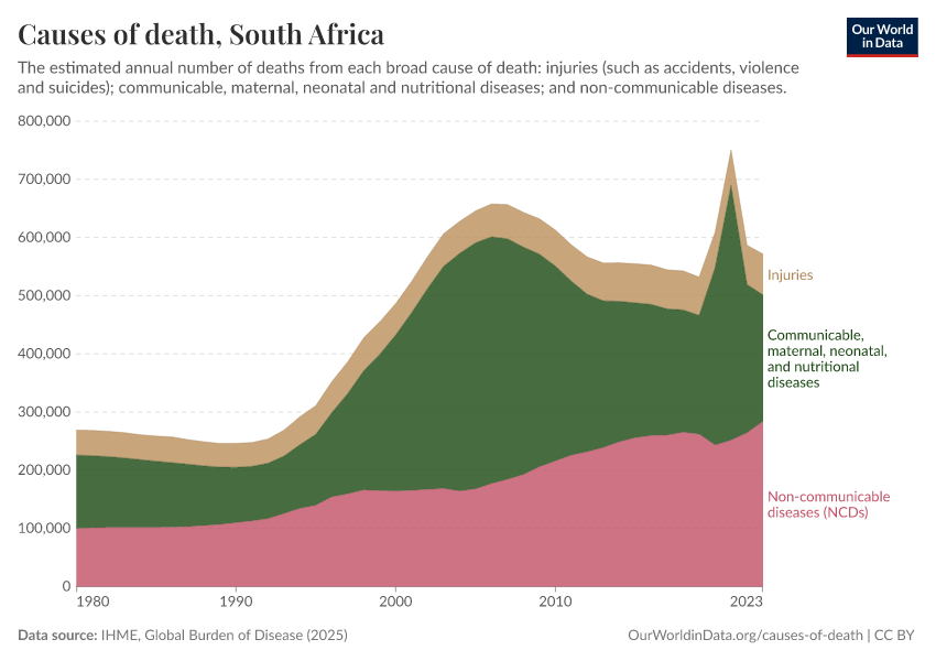 In the chart, you can see the breakdown of deaths in South Africa by these broad categories. In 2023, 218,000 died from communicable diseases, 284,000 from NCDs, and 70,300 from injuries.