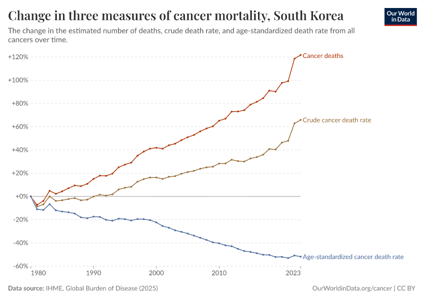 There are several metrics we can use to understand mortality: the total number of deaths, the crude death rate (which simply divides the number of deaths by the country’s population), or the age-standardized death rate, which holds the age structure of the population constant, removing the effect of population aging from the trend.